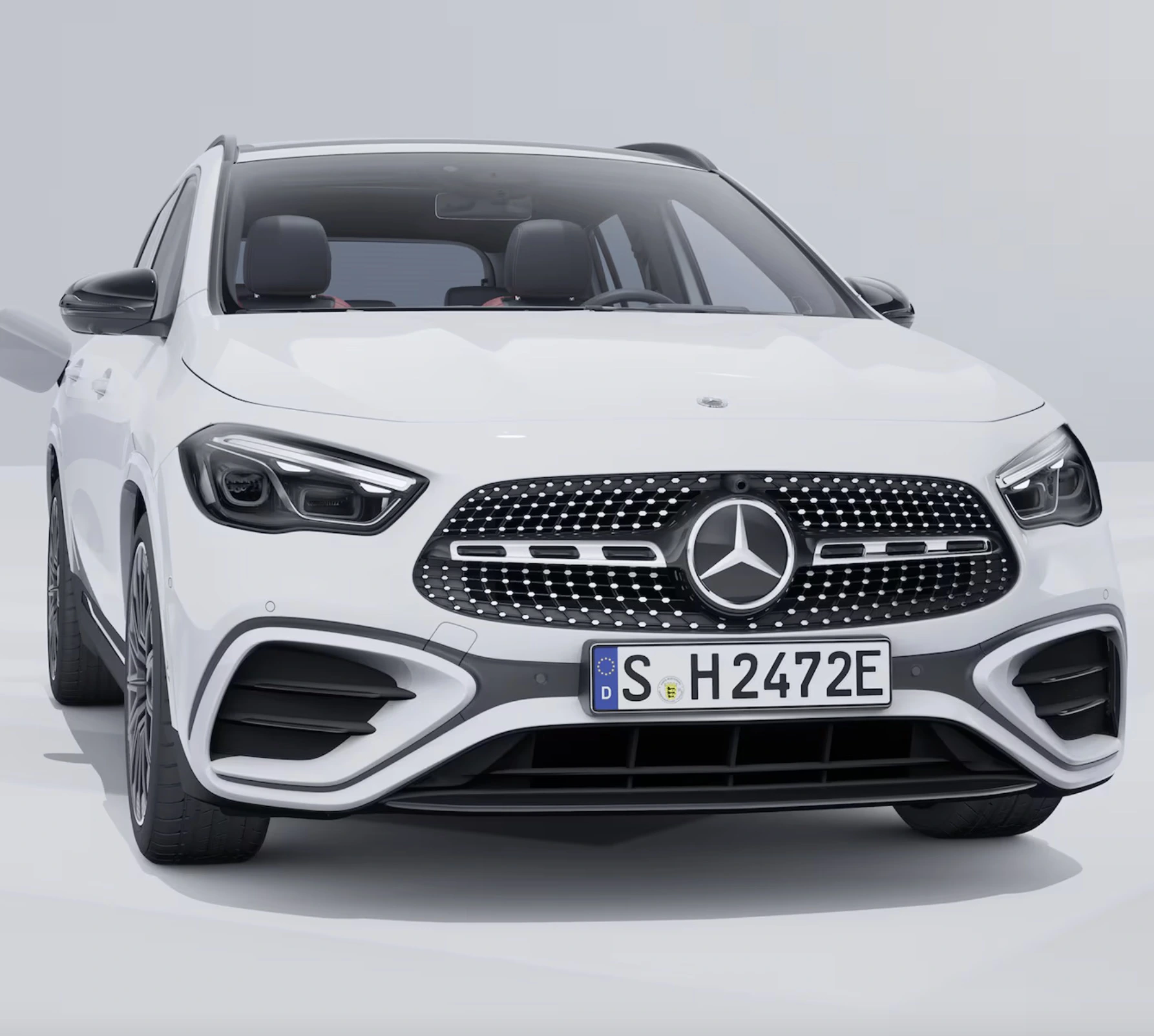 El Mercedes GLA se distingue por su carrocería compacta de estilo SUV, con una calandra ancha y faros LED envolventes. Sus voladizos cortos y su altura elevada le otorgan un aire robusto, mientras que los protectores laterales resaltan su carácter aventurero.